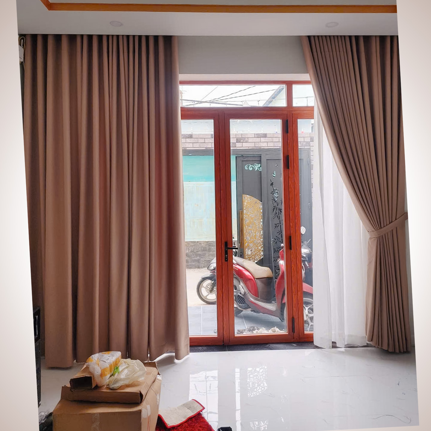 Chất liệu đẳng cấp: Lớp vải chính mang sắc nâu tây ấm áp, sang trọng. Bề mặt vải được dệt với những sợi chỉ to chắc chắn như vải bố nhưng lại có độ trơn mịn tinh tế. Chính đặc tính này giúp rèm ít bám bụi, giữ cho không gian luôn sạch sẽ và bền màu theo thời gian.