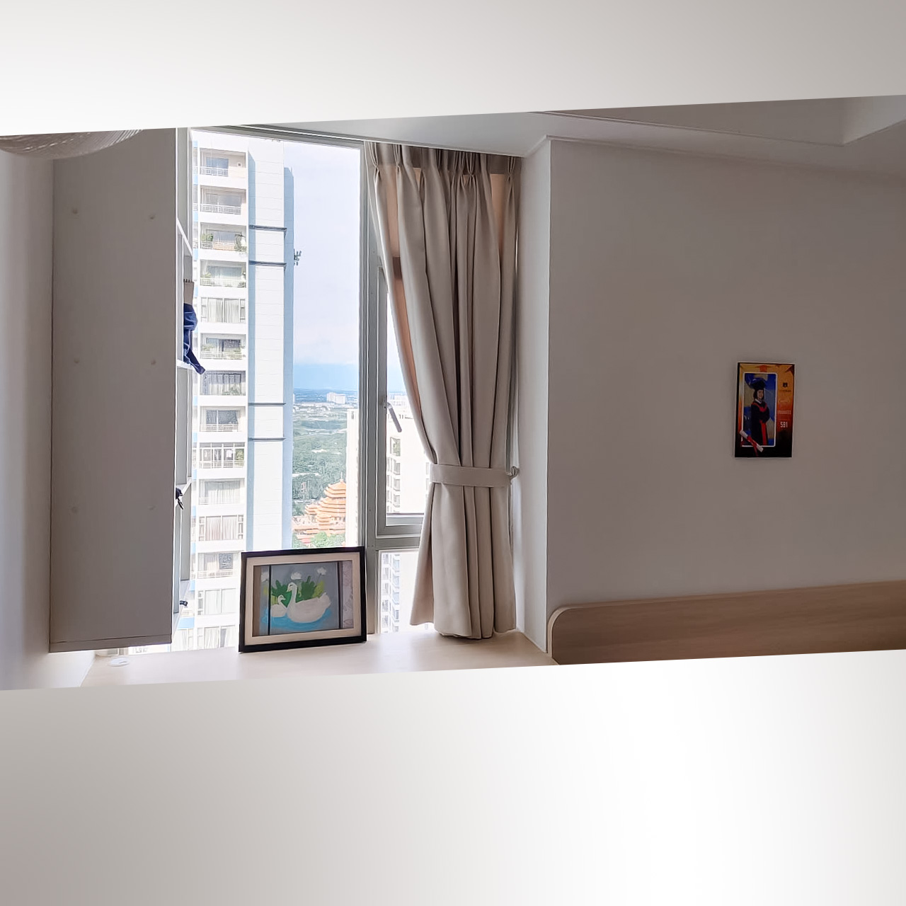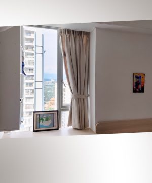 - Cửa chính phòng khách: Ô cửa panorama rộng đến 5m ngang là điểm nhấn đắt giá, mở ra tầm nhìn tuyệt đẹp từ tầng 31 bao quát toàn cảnh thành phố lung linh và một phần sông Sài Gòn uốn lượn. Để tối ưu hóa vẻ đẹp này, gia chủ đã chọn rèm vải buông mềm mại, vừa có tác dụng che nắng khi cần, vừa là một yếu tố trang trí sang trọng, hiện đại. Buổi tối, khi đèn thành phố lên, khung cảnh qua lớp rèm hé mở càng thêm phần huyền ảo.