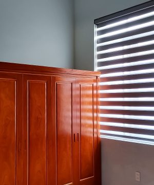 Với công trình này, chúng tôi đã khéo léo sử dụng hai loại rèm để tạo nên sự hài hòa tuyệt đối: rèm vải gấm một màu hoa văn nổi cao cấp cho các khung cửa lớn và rèm cầu vồng Hàn Quốc cho những ô cửa sổ nhỏ.