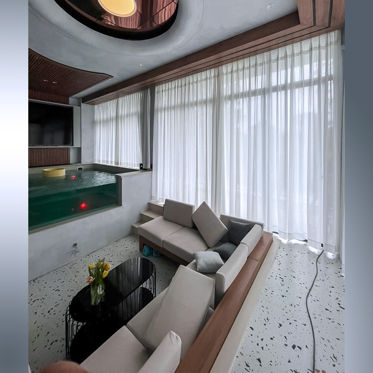 - Rèm vải voan cho cửa lớn và cửa sổ cạnh bể bơi: Phòng khách biệt thự sở hữu hai cửa ra vào rất lớn nằm cạnh nhau và một ô cửa sổ lớn ngay cạnh khu vực bể bơi. Tất cả các cửa này đều được lắp đặt rèm vải voan màu trắng tinh khiết. Lớp voan này mang lại ánh sáng tự nhiên dịu mát, tạo cảm giác rộng rãi, thoáng đãng và sang trọng cho không gian phòng khách, đồng thời vẫn đảm bảo sự riêng tư nhẹ nhàng. Voan được may xếp ly và lắp đặt âm trần, duy trì tính thẩm mỹ cao.