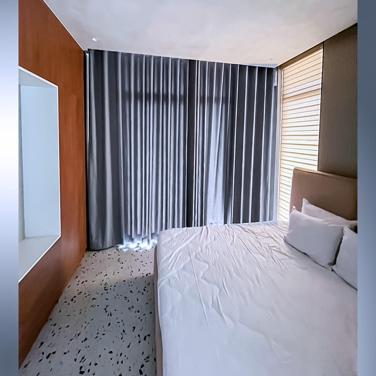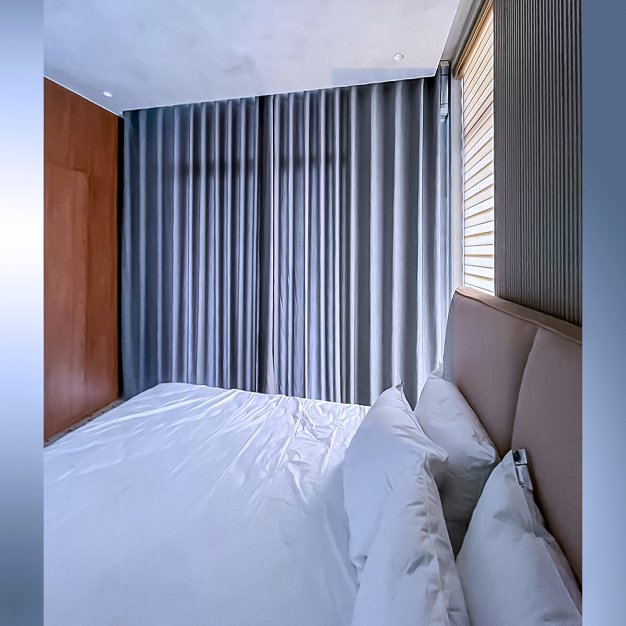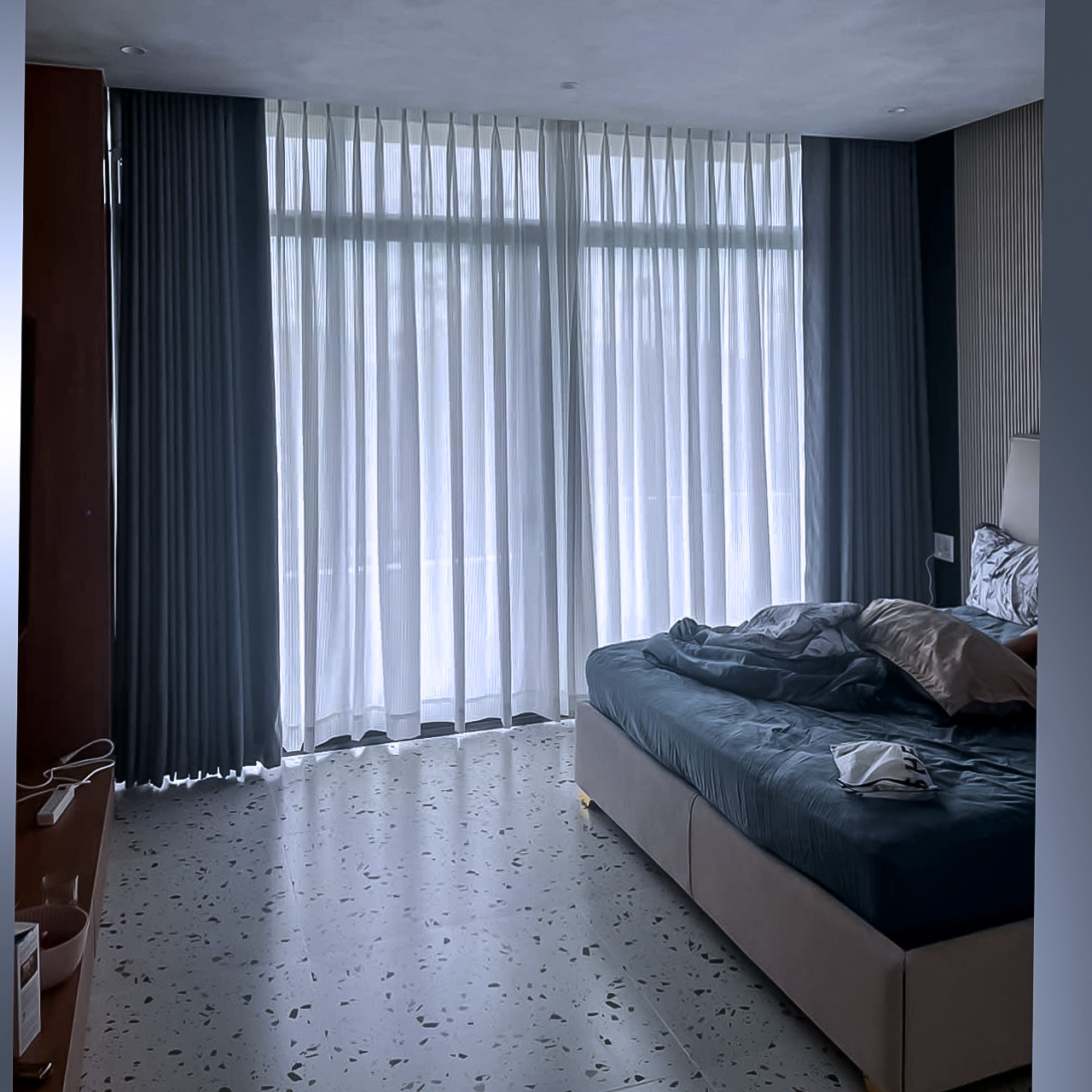 - Kỹ thuật may & Lắp đặt: Rèm vải chính được may theo kiểu định hình (giả xỏ lỗ), tạo ra những sóng rèm đều tăm tắp, sang trọng và hiện đại. Lớp voan được may xếp ly, giúp cho việc đóng/mở rèm bằng mô tơ tự động trở nên mượt mà và dễ dàng hơn bao giờ hết. Rèm Cửa Thiên Kim còn tỉ mỉ áp dụng kỹ thuật may chuẩn mực với lên lai 10cm tạo độ nặng và sự vững chãi cho phần chân rèm, giúp rèm rủ thẳng đứng đẹp mắt, không bị cong vênh hay bay lật. Việc gấp biên 4cm cũng tăng cường độ dày và chắc chắn cho mép vải, chống sổ sợi hiệu quả, đảm bảo độ bền vượt trội và vẻ đẹp tinh tế cho bộ rèm. Tất cả rèm cửa 2 lớp tại phòng ngủ đều được bắt thanh nhôm âm trần thạch cao, mang lại vẻ đẹp liền mạch, tinh tế như một phần của kiến trúc ngôi nhà.