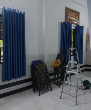 - Rèm cửa sổ phòng khách & phòng ngủ: Tại các khu vực cửa sổ, rèm cửa màu xanh dương sẫm trở thành điểm nhấn nổi bật trên nền tường trắng, tạo nên sự cân bằng hoàn hảo giữa ánh sáng tự nhiên và sự riêng tư. Chúng không chỉ là vật trang trí mà còn giúp điều tiết lượng ánh sáng đi vào phòng, giữ cho không gian luôn dễ chịu.