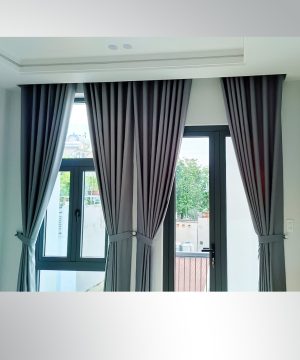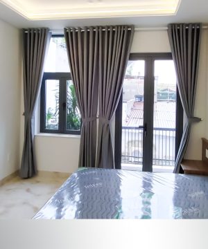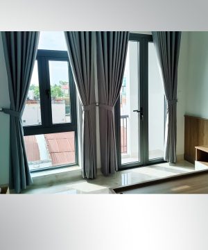 - Phòng ngủ trước: Gian phòng này có đặc thù kiến trúc với hai ô cửa (một cửa ra ban công và một cửa sổ) đều quay ra mặt tiền nhưng lại có cao độ đặt lệch nhau để phục vụ cho ý đồ thiết kế mặt tiền của ngôi nhà. Đây là một thách thức không nhỏ về mặt thẩm mỹ. Tuy nhiên, với kinh nghiệm dày dặn, Rèm Thiên Kim đã tư vấn cho gia chủ một giải pháp thông minh: bắt rèm cao từ sát trần nhà xuống và đảm bảo cả hai bộ rèm có chiều cao bằng nhau, dài chạm đất. Kỹ thuật may đo chính xác và lắp đặt khéo léo của đội ngũ chúng tôi đã hoàn toàn khắc phục được tình trạng lệch cốt, mang đến sự cân đối, hài hòa và vẻ đẹp sang trọng cho căn phòng. Gia chủ đã vô cùng hài lòng với sự tinh tế và hiệu quả của giải pháp này.