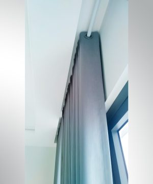 Không gian tầng 2 nổi bật với một phòng ngủ ở phía trước mặt tiền, có kết cấu cửa tương tự như phòng ngủ trước ở tầng 1: bao gồm một cửa ra vào và một cửa sổ bên cạnh, và cả hai cũng có sự chênh lệch về cao độ. Gia chủ một lần nữa lựa chọn giải pháp rèm vải 3 lớp màu xám họa tiết 3D từ Rèm Thiên Kim. Và cũng như tầng dưới, chúng tôi đã tư vấn và lắp đặt rèm cao bằng nhau, từ trần thả dài chấm đất. Đặc biệt, phòng ngủ này được trang bị sẵn hộc thạch cao, giúp việc lắp đặt rèm trở nên hoàn hảo hơn, giấu trọn phần thanh treo, khiến bộ rèm càng thêm sang trọng, tinh tế và như hòa làm một với kiến trúc tường trần.