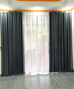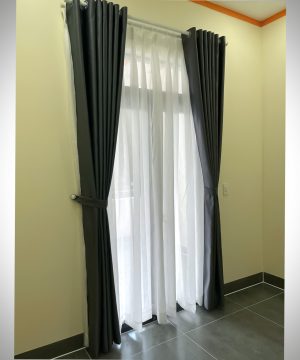 - Lớp Vải Chính: Lớp rèm này thường được làm từ vải dày, có khả năng chống nắng, cản sáng và cách nhiệt hiệu quả. Trong công trình tại Thông Tây Hội, chúng tôi đã sử dụng loại vải 3 lớp cao cấp với mặt phải có vân nổi nhẹ, tạo cảm giác sang trọng và độc đáo. Lớp giữa là những sợi chỉ to đồng màu, không chỉ tăng cường khả năng chống nắng lên đến 99% mà còn giúp giảm thiểu tiếng ồn từ bên ngoài, mang lại không gian yên tĩnh, thư thái. Màu xám đậm của rèm dễ dàng phối hợp với nhiều phong cách nội thất, từ hiện đại đến cổ điển.