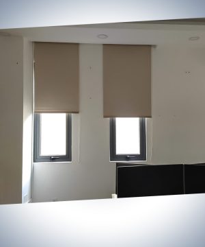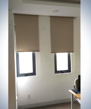 - Màu sắc và vẻ đẹp: Các ô cửa sổ nhỏ được trang bị rèm cuốn trơn có tông màu be hoặc kem. Màu sắc này không chỉ mang lại cảm giác ấm áp, dễ chịu mà còn tạo vẻ đẹp tối giản, phù hợp với phong cách văn phòng hiện đại.