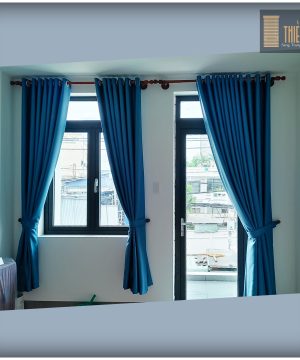 Rèm vải gấm màu xanh dương hoa văn nổi có kim tuyến là sự lựa chọn hoàn hảo để tạo nên một không gian phòng ngủ sang trọng và quyến rũ. Chất liệu gấm mềm mại, óng ánh với họa tiết hoa văn nổi bật, kết hợp với những sợi kim tuyến lấp lánh tạo nên hiệu ứng thị giác ấn tượng. Màu xanh dương dịu nhẹ mang đến cảm giác thư thái, bình yên, giúp bạn dễ dàng chìm vào giấc ngủ sâu. Những chiếc rèm này không chỉ có tác dụng che chắn ánh sáng mà còn là điểm nhấn trang trí tuyệt đẹp cho phòng ngủ nhà phố của bạn.